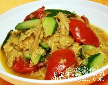 3、锅内加油先泡软的腐衣、再加入黄瓜、西红柿一道翻炒到黄瓜、西红柿断生、加入盐、糖、素蚝油即可起锅。