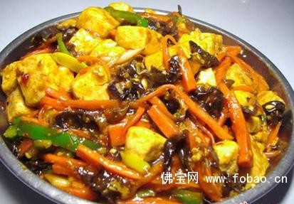 4、豆腐从盐水中捞出沥干水分,热锅凉油,放入蒜末爆香,放胡萝卜木耳翻炒,听到木耳爆出响声,放豆腐翻炒,至金黄色,放调好的汁小火咕嘟一下,放一勺盐,待汤汁浓稠后关火,出锅装盘撒上小香葱即可