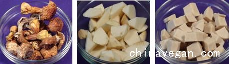 1、干巴西蘑菇10朵 2、山药300公克 3、素鸡丁(或素火腿丁)100公克
